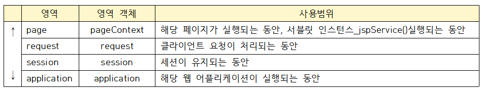 JSP가 제공하는 9가지의 내장객체 중 4가지(pageContext, session, request, application)은 각각 특정 범위(scope)와 그 범위 안에서 공유할 수 있는 객체(데이터)(Attribute)를 가진다.