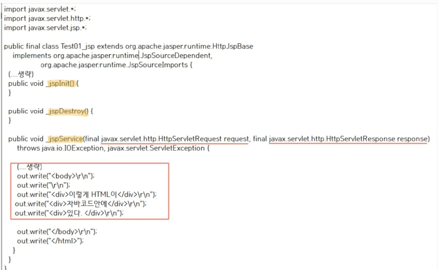 네모상자 안을 보면, out.write();안에 HTML코드가 있는 것과