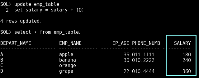 문제 2) 모든 직원의 월급을 10만원 인상.