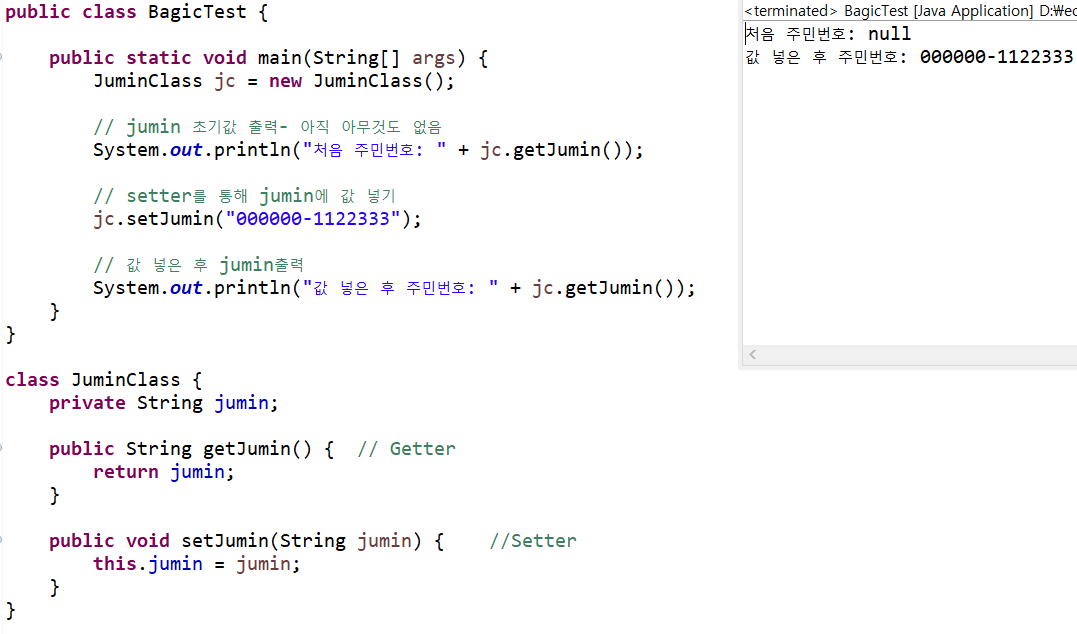 getter는 private를 외부로 꺼내는 메서드, setter는 private에 값을 넣는 메서드이다.