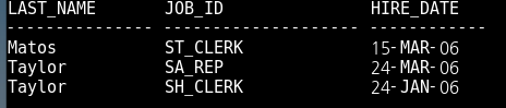 8. Matos 및 Taylor라는 last_name을 가진 사원의 last_name, job_id, hire_date 를 출력하는 구문을 출력하되,