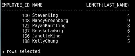 select employee_id, concat(first_name, last_name) name, length(last_name)