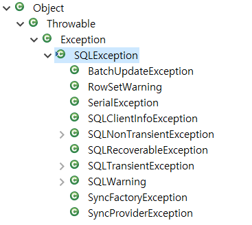 예외 클래스 위에 마우스를 두고 f4를 누르면 이렇게 클래스의 관계들을 볼 수 있다.