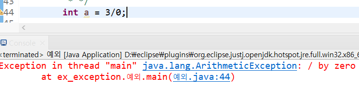 슬러시(/) 뒤에 예외발생의 원인이 나온다. : by zero => 0으로 나눠서 발생