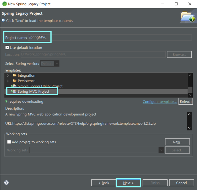 왼측 Exploror에 Spring Legacy Project를 클릭해서 프로젝트를 생성한다.