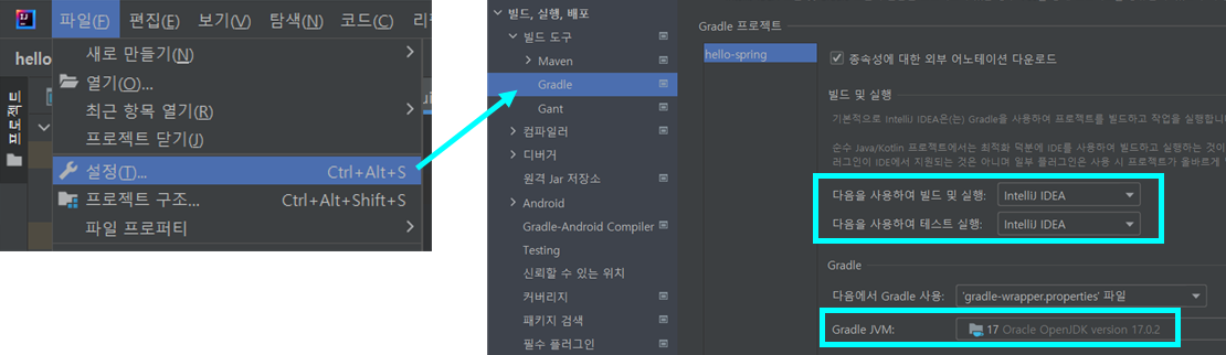 File - 설정(Settings) - 빌드, 실행, 배포 - Gradle