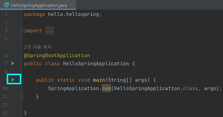 프로젝트 폴더 > src> main > java > 폴더(개인마다 다름) > HelloSpringApplication.java