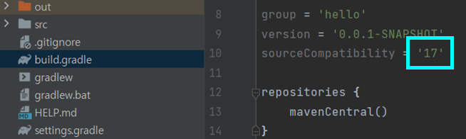 sourceCompatibility = 해당 버전 17이면 17, 11이면 11등 버전을 확인한다.