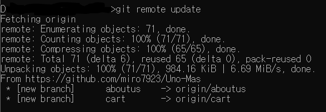 원격지에 바뀐 브랜치가 있으니 업데이트를 하면 [new branch]로 새로운 브랜치가 들어온다.
