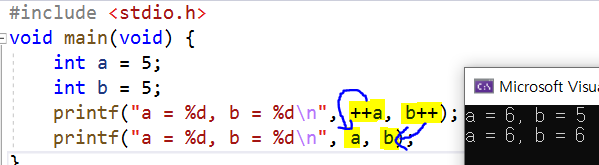 a는 ++a로 전위 증감을 했기에 해당라인에서 바로 +1을 하고 => 5+1 = 6