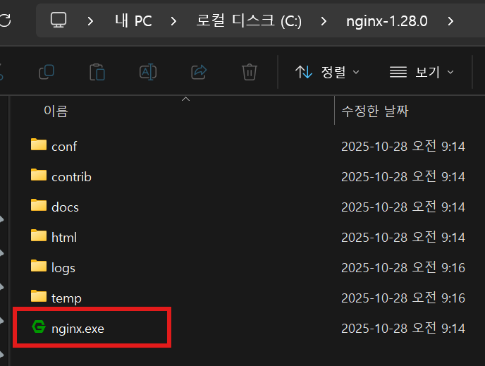 다운받고 압축을 풀면 nginx.exe 파일이 보이는데 더블클릭해서 실행하면된다.