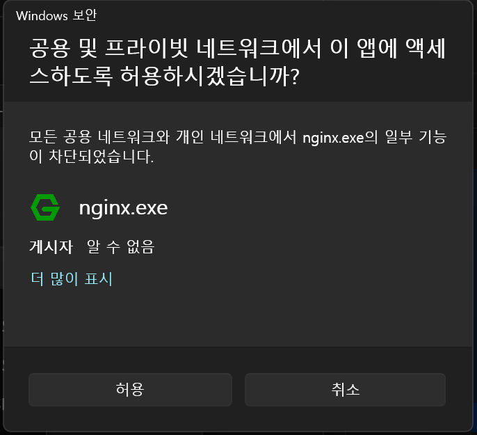 IIS (Windows Web Server) 가 80번 포트를 이미 사용하고 있어서 IIS서비스를 끄거나 nginx포트를 변경해야한다.