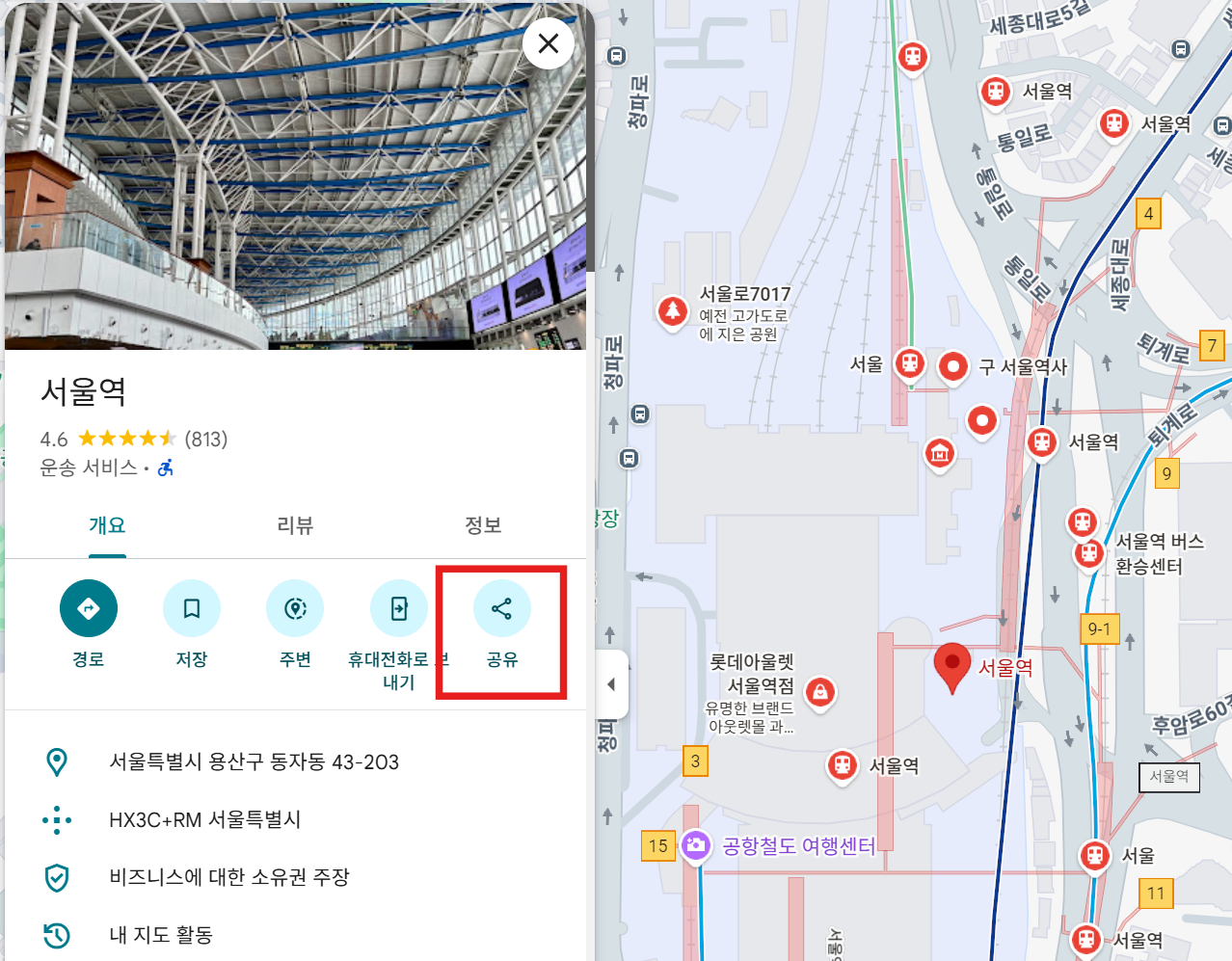 장소가 검색되면 "공유"버튼 클릭