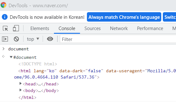 #document가 나오고 하위로 html내용이 보인다. => 현재 DOM 전부.